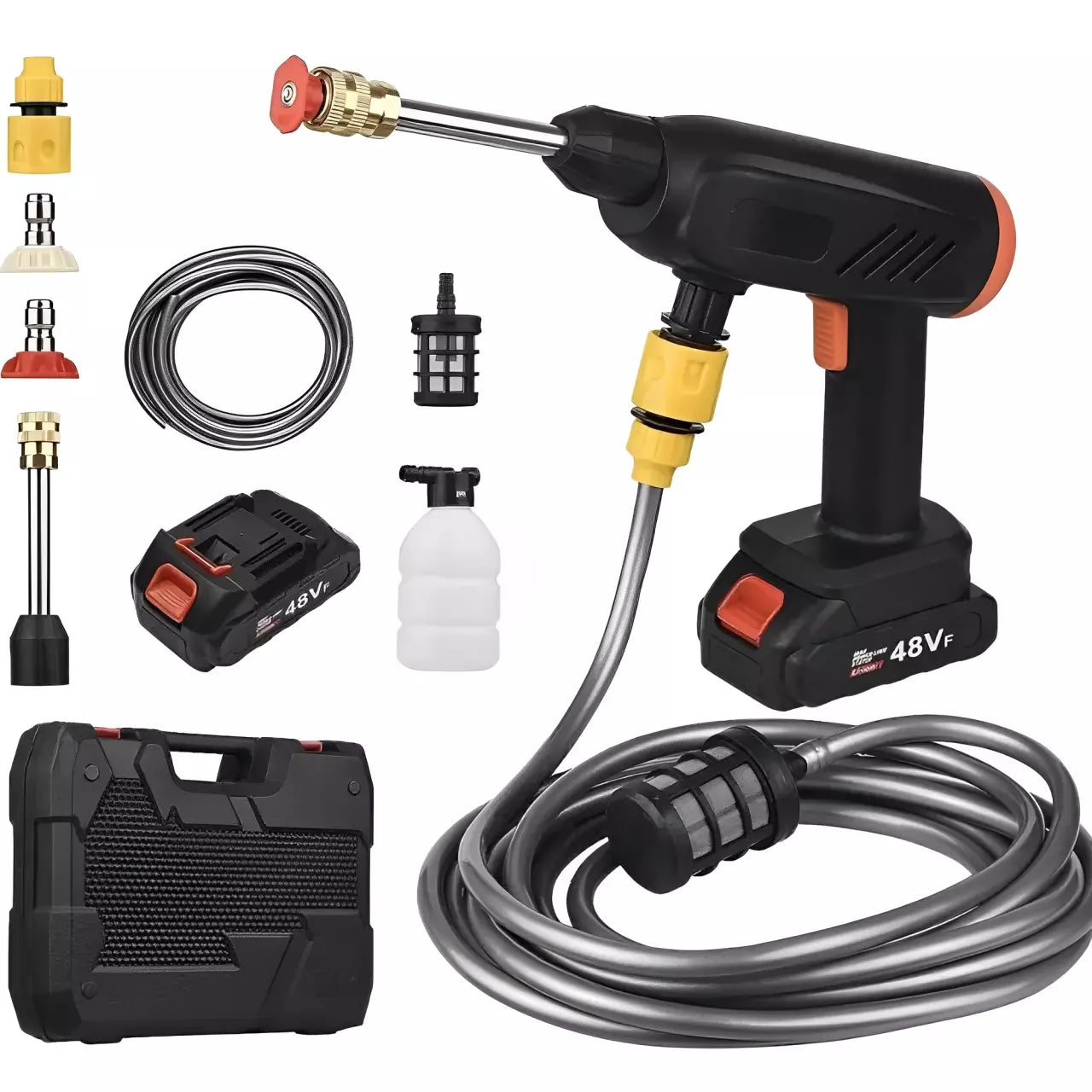 - Acessórios incluídos: Bicos de alta pressão, adaptador de mangueira e cabo de carregamento.